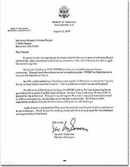 Again, I want to commend the Worcester Women's History Project for their contributions to our community. I look forward to working closely with them as we prepare for the challenges and opportunities of the future.